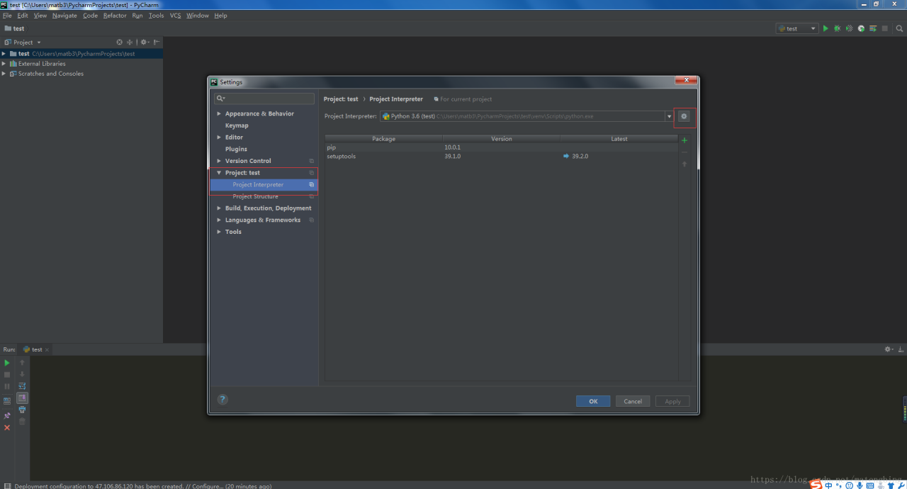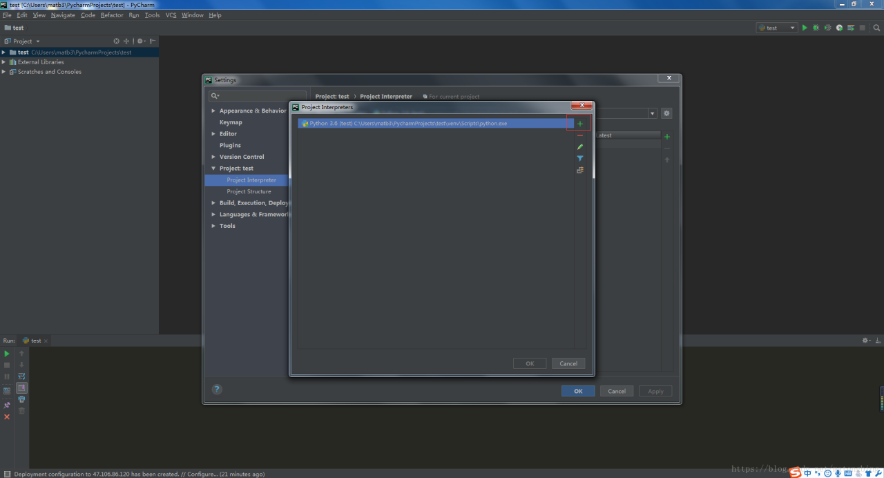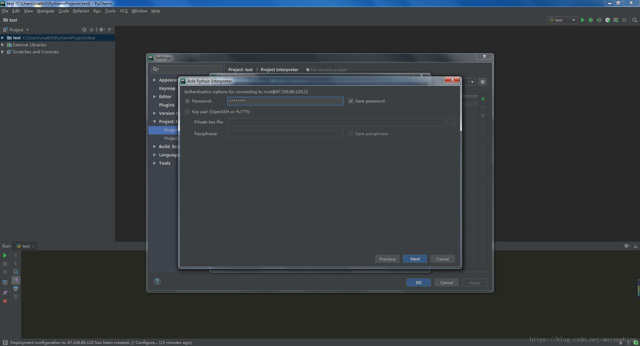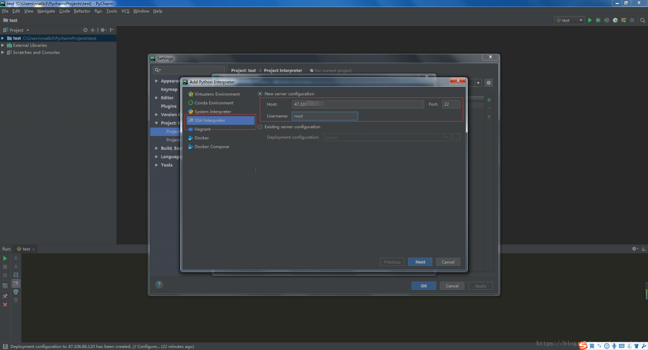 选中SSH Interpreter,填写服务器地址,用户名