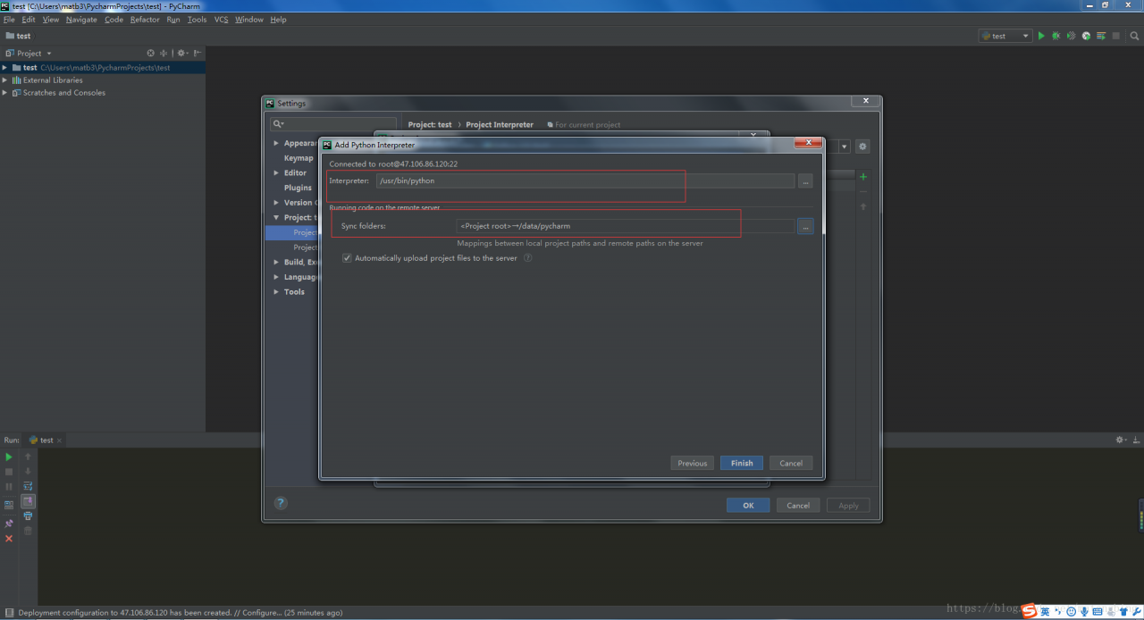 点击next,填写linux服务器的python路径和项目在linux服务器的存储路径