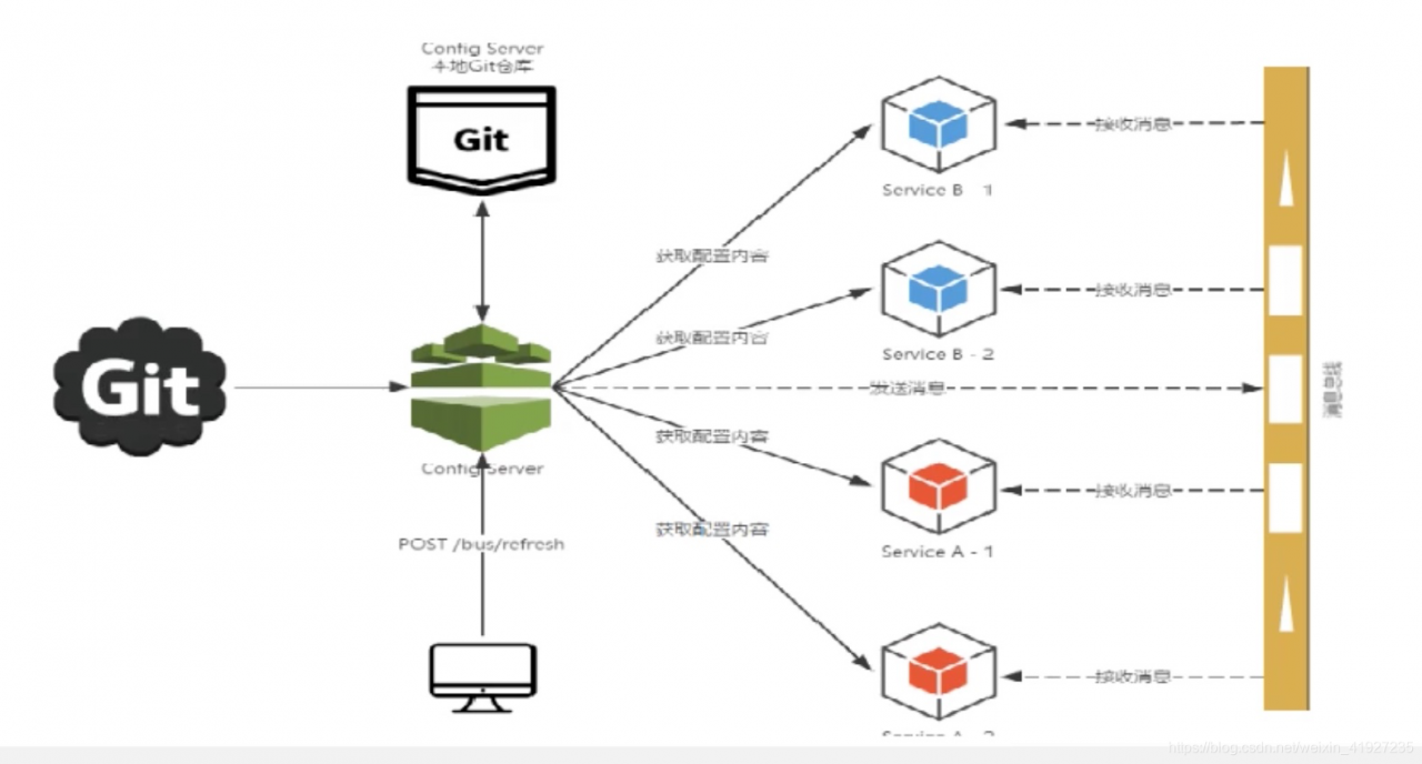 3. 有一定局限性,例如,微服务在迁移的时候,它的网络地址常常发生变化,此时如果想要做到自动刷新,那就会增加更多的修改 - 利用消息总线触发一个服务端ConfigServer的bus/refresh端点,而刷新所有客户端配置