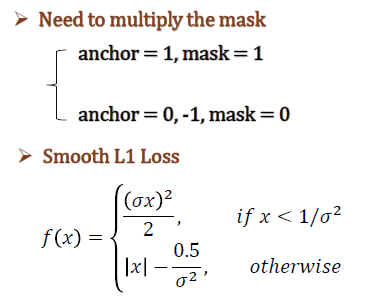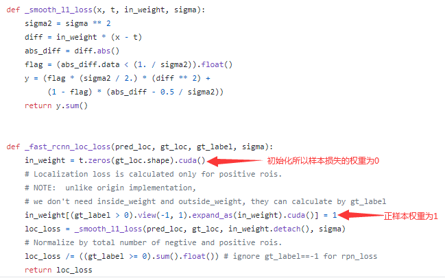 这里,Smooth L1 Loss 的实现有个技巧,通过给正负样本设置不同的损失权重,其中负样本权重为0,正样本权重为1,这样就可以忽略负样本的回归损失。