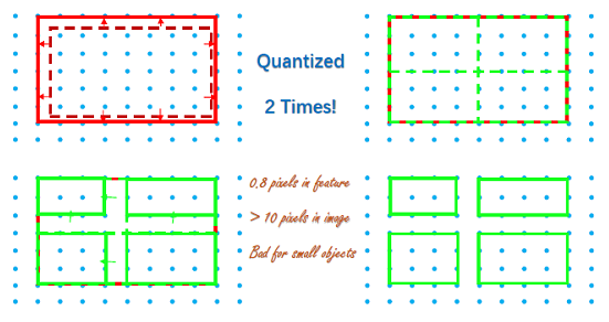 在将RoI映射至特征图尺寸范围的过程中,下采样取整操作(比如200x200的区域经16倍下采样后映射为12 x 12)会产生一次量化损失;接着,假设最终需要生成的尺寸大小为nxn,则需将RoI划分nxn个bin,在这个划分过程中又会产生一次量化损失(比如对12x12大小的RoI划分成7x7个bin,每个bin的平均尺寸是