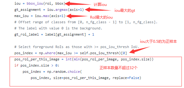 具体方法是,计算每个RoI与每个gt的IoU,若某个RoI与所有gt计算所得的最大IoU不小于0.5,则为正样本,并记录下与此对应的gt,打上相应的类别标签,同时限制正样本数量不超过32个。