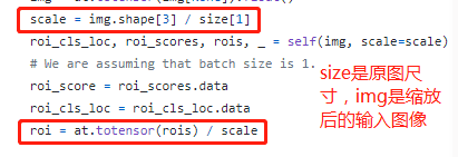 另外,在Faster R-CNN的实现中,anchor和RoI的尺寸对应的是网络的输入图像,而原图像和输入图像之间做了尺寸缩放,如以下代码部分可看到一个'scale'变量,在预测的时候注意需要把结果根据缩放系数转换对应到原图上。