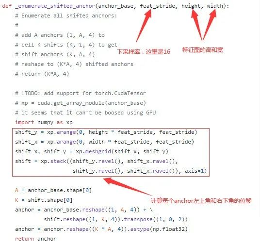 具体的实现方法是,先计算fm中的一个点(通常是左上角)对应的9个anchor的中心点坐标和长宽,其它点对应的anchor则通过平移计算得出。