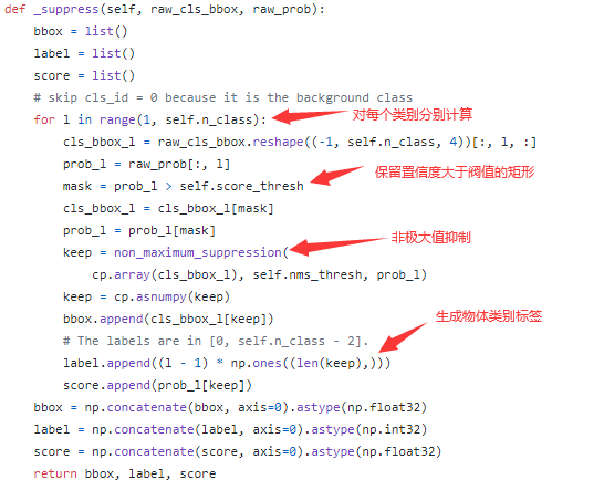 注意,这里在进行置信度筛选以及NMS时是分别对每个物体单独类别实施的,不包括背景类(下图range()从1开始)。