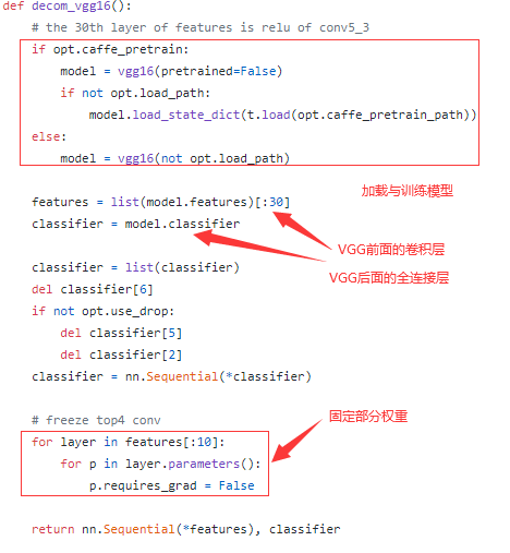 最初的Faster R-CNN使用了预训练的VGG16作为backbone进行特征提取,实现方法是加载预训练模型,抽取并分离前面的卷积层和后面的全连接层,固定卷积层中部分层的权重,用作特征提取,而全连接层则给 RoIHead 用作分类和回归。
