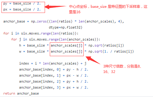 不知道诸位客观发现了没,在上图计算anchor_base坐标时,有可能出现负数!比如对于特征图左上角的那个点(0,0),其作为anchor中心点,由于下采样了16倍,那么就对应于输入图像16x16的区域,于是映射到输入图像上anchor中心点就是(8,8)。