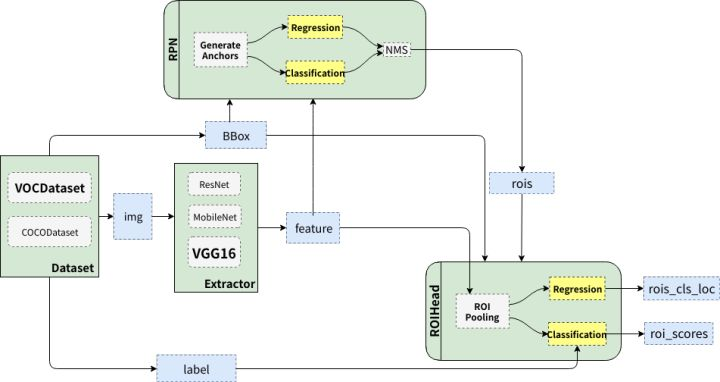 如下为整体框架结构,结合上述过程来看,主要是三部分,Extrator进行特征提取、RPN 生成候选框、RoIHead对候选框进行分类并调整目标预测框的位置与大小。