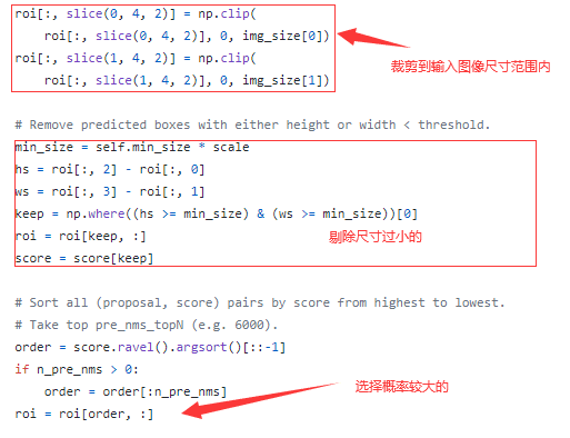 具体做法是,先将回归得到的候选区域的宽、高限制在输入图像尺寸范围内以及剔除尺寸过小(小于16x16,因为特征图中一个像素点就已经代表了输入图像16x16的区域。