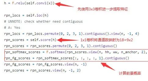 这里的分类是二分类,仅仅区分前景和背景,具体做法是,先将 fm 进行3x3卷积,进一步提取特征,然后使用1x1卷积将通道数映射到18=9x2,对应9个anchor的两个类别,然后再将通道这个维度分割多一个维度,使得最后一维是2,代表前景和背景,最后使用softmax计算概率。