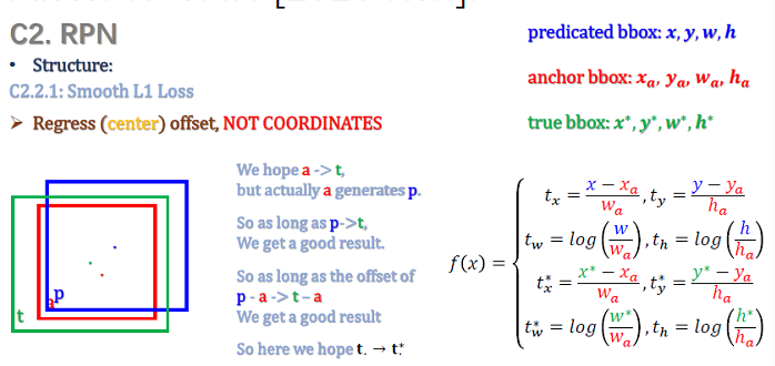那么如何计算offset和scale呢?拿上图RPN的例子来说,对于预测框(蓝色框),offset等于其中心点与anchor(红色框)中心点坐标差除以anchor边长,scale等于两者的长宽比,并且使用log函数,log函数的作用也是一定程度上抑制了大bbox之间的误差占比盖过小bbox(拉近了大、小bbox之间的误差水平),gt(绿色框)的计算方法类似。