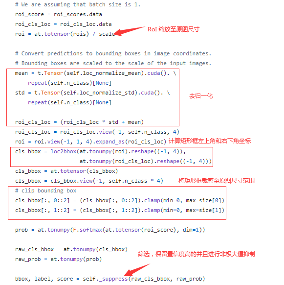 接着对回归的结果去归一化(乘标准差加均值),结合RoIs的位置和大小计算出bbox的位置(左上角坐标和右下角坐标),并且裁剪到原图尺寸范围内。