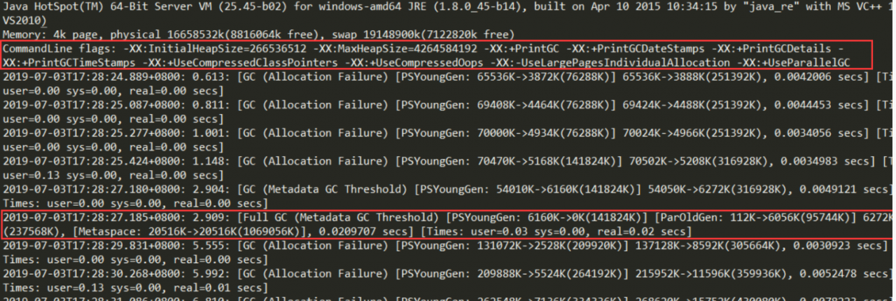 - Full GC(Metadata GC Threshold)指这是一次 full gc,括号里是 gc 的原因, PSYoungGen 是年轻代的 GC, ParOldGen 是老年代的 GC,Metaspace 是元空间的 GC
