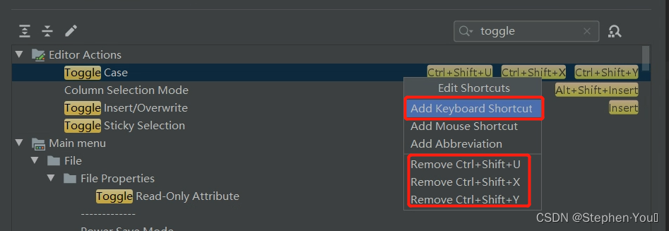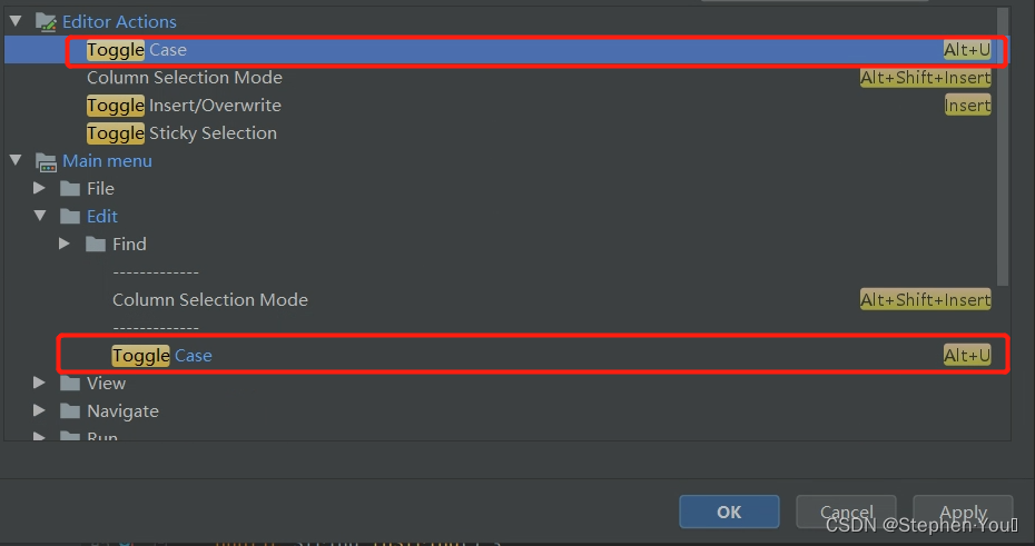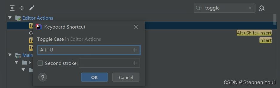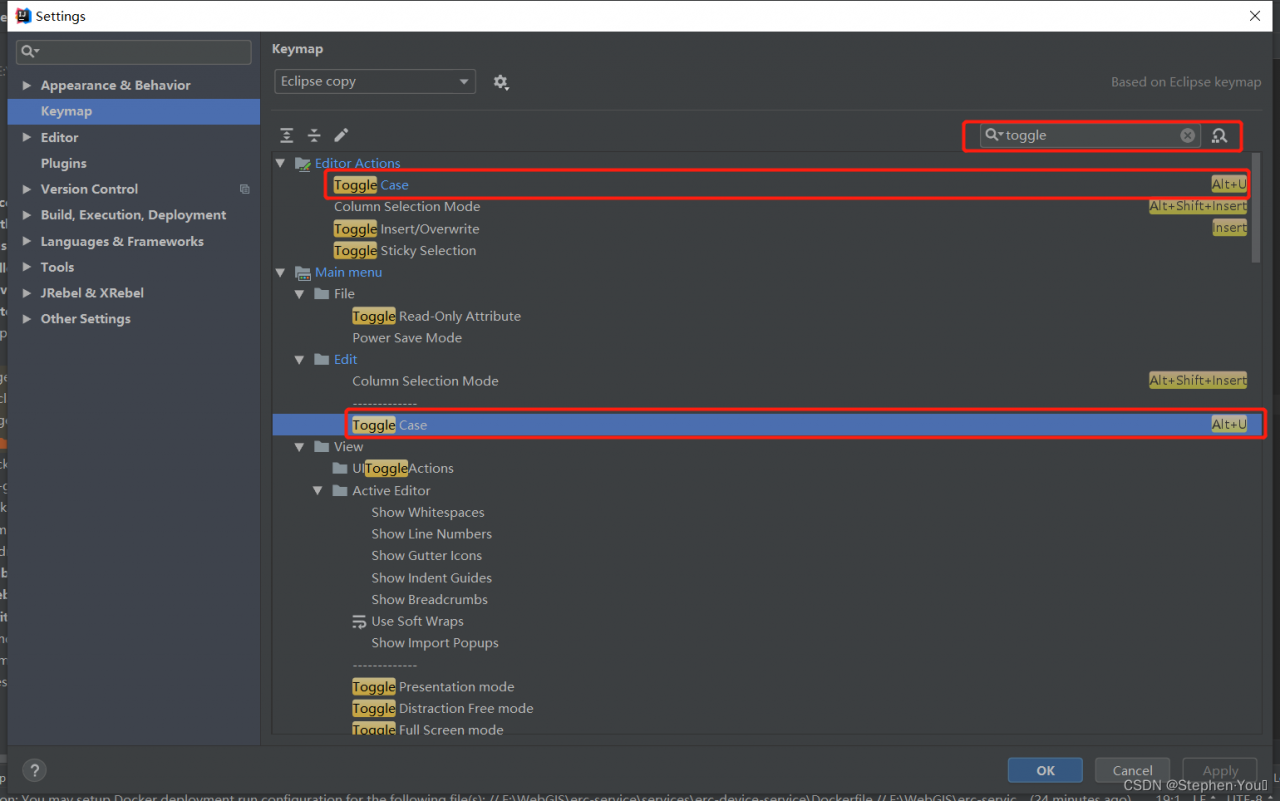 打开File-Settings-Keymap选项卡,在右上角的搜索框中,输入toggle,找到下图红框汇总所示的 Toggle Case 属性,有两个,为了保持一致,最好是两个都修改成一样的快捷键规则: