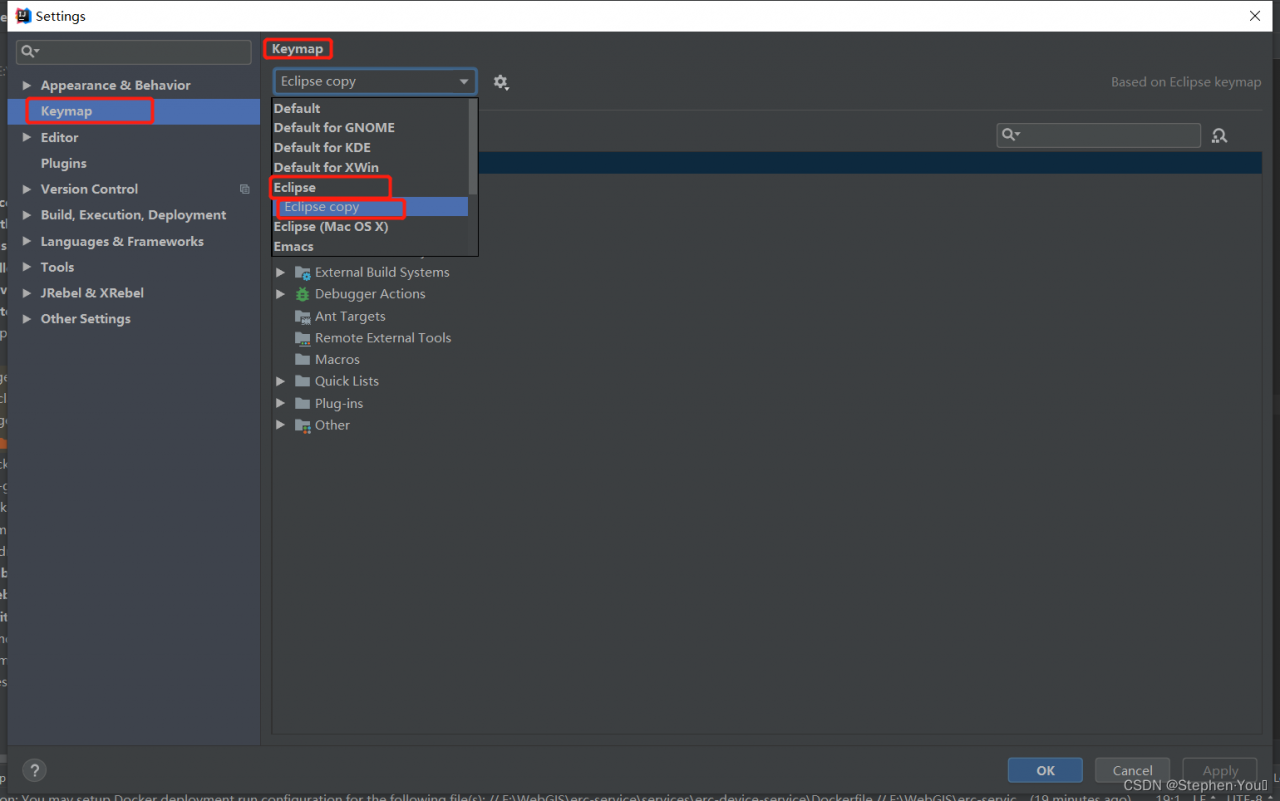 打开IDEA的Settings窗口(File-Settings),在 Keymap选项卡里面,在下拉列表中,找到Eclipse并点击右下角的 OK即可。我这里选的 Eclipse copy,这是因为我在选了Eclipse 之后,曾经有对其中的某些快捷键规则进行过自定义修改,因为每个人总有自己的按键习惯。
