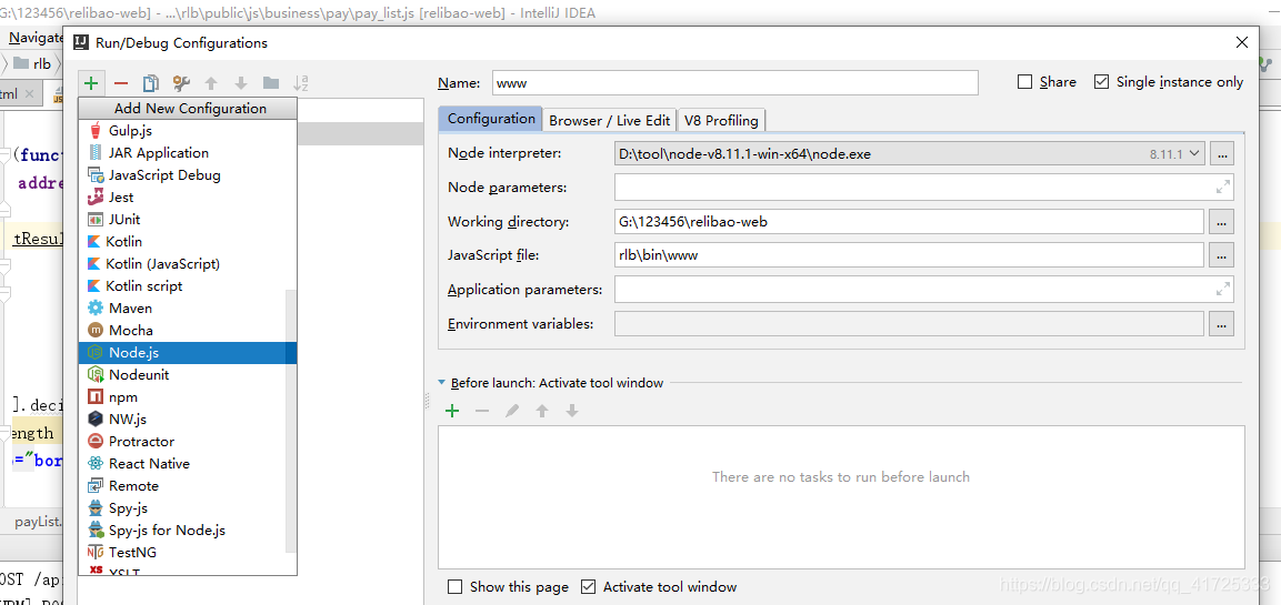 idea中导入前端项目,配置备忘录1.首先,在settings中查找nodejs,并进行下载2.然后,进入到如图所示进行设置3.接着,点击添加找到node.js,进行如图所示配置,即可完成 版权声明:本文为qq_41725333原创文章,遵循CC 4.0 BY-SA版权协议,转载请附上原文出处链接和本声明。原文链接:https://blog.csdn.net/qq_41725333/article/details/94029665