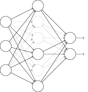 上图是标准的神经网络,经过dropout后,则变成如下图:
