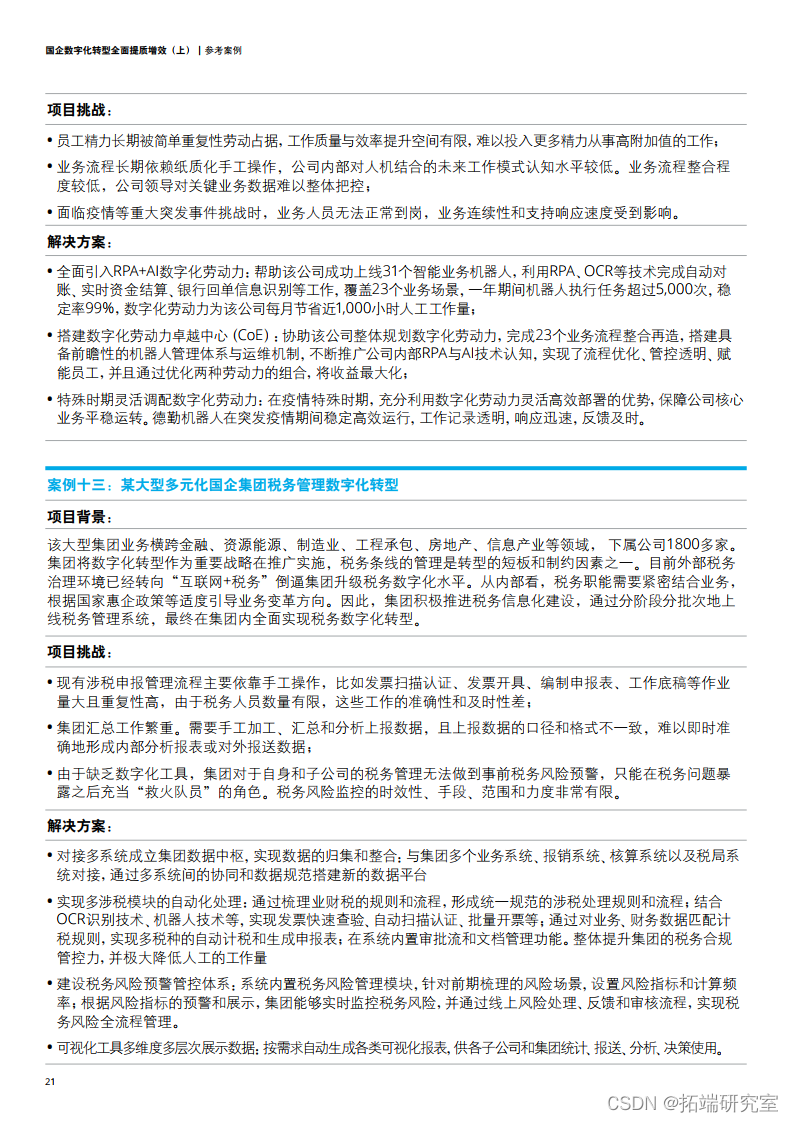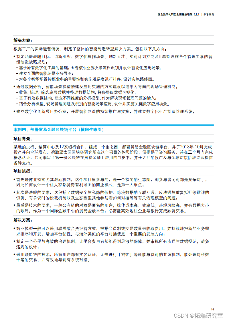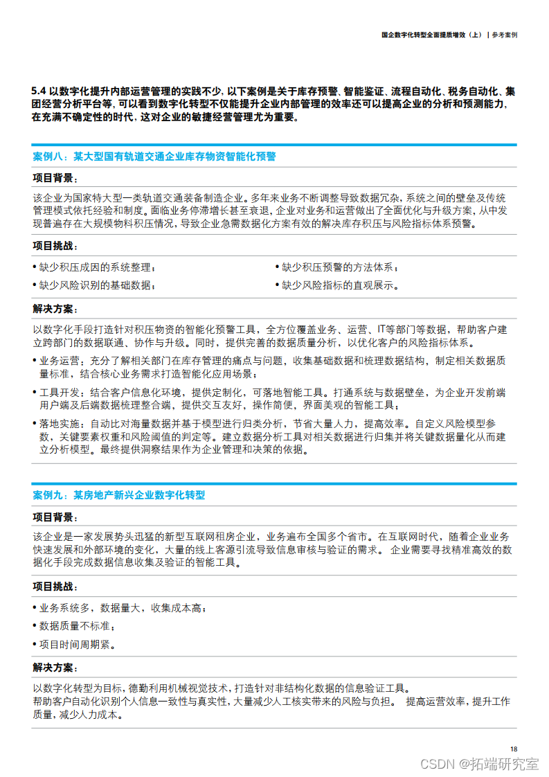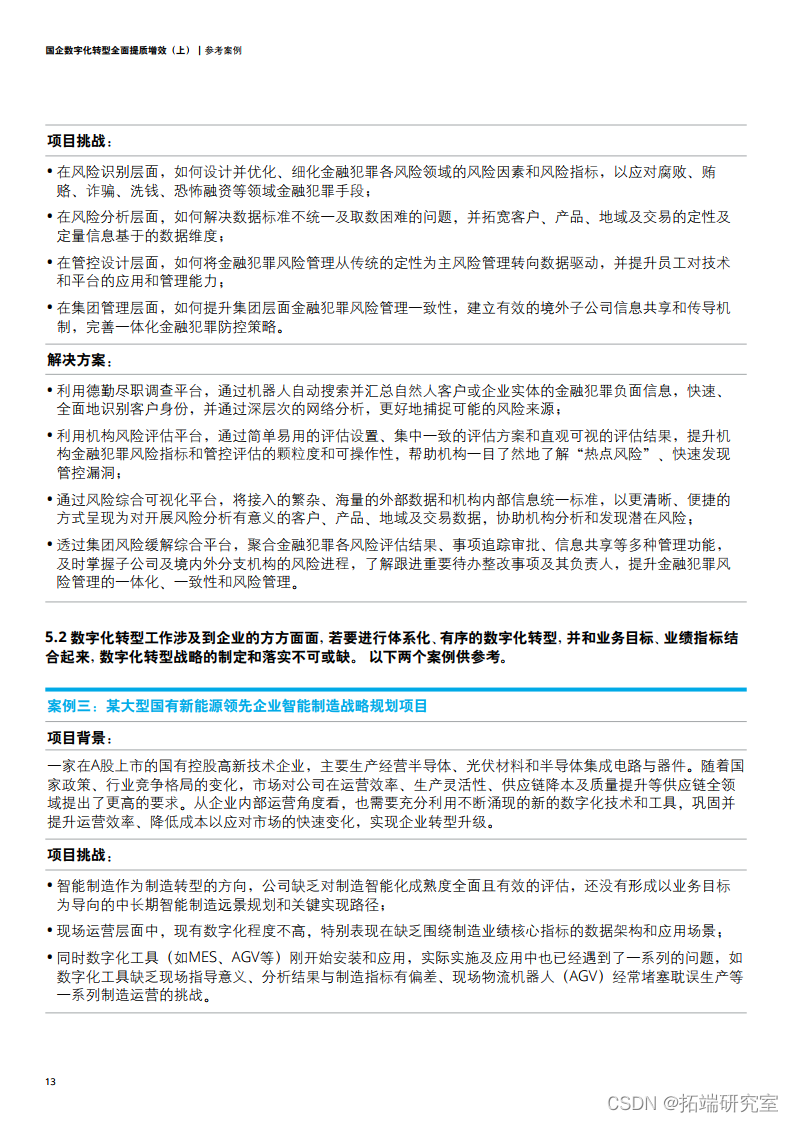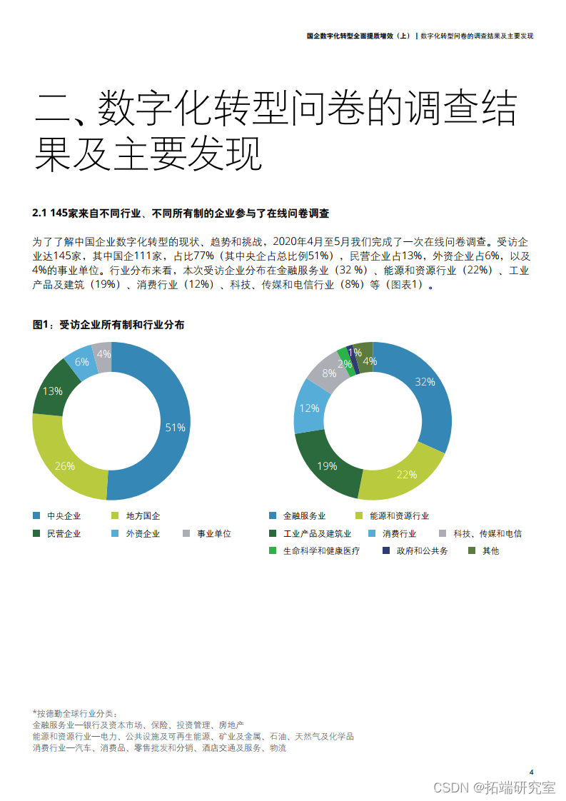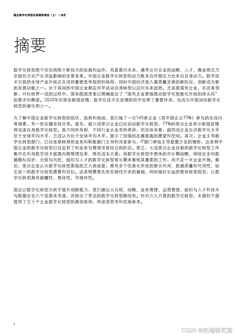 数字化转型绝不仅仅局限于新技术的实施和运作,而是面对未来,通常会对企业的战略、人才、商业模式乃至组织方式产生深远影响的全面变革。本报告通过一次对145家(国企占77%)来自不同行业、不同所有制的企业的在线问卷调查,发现:
