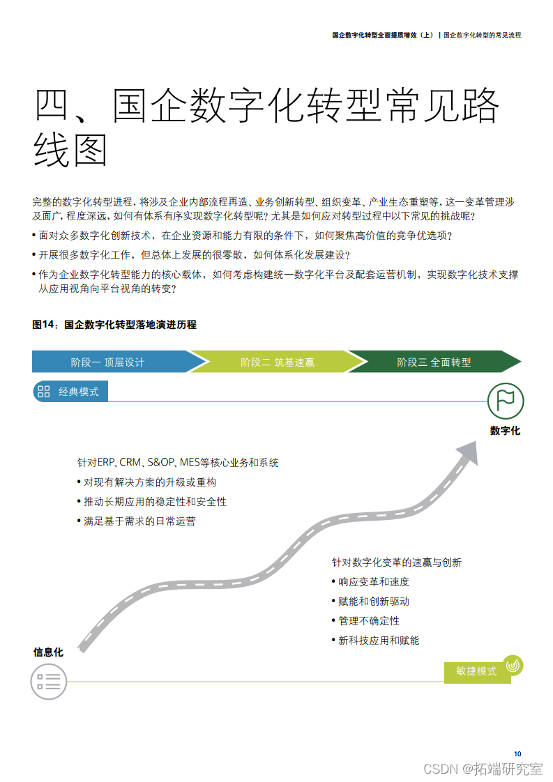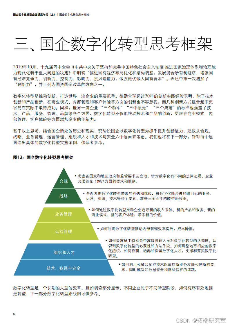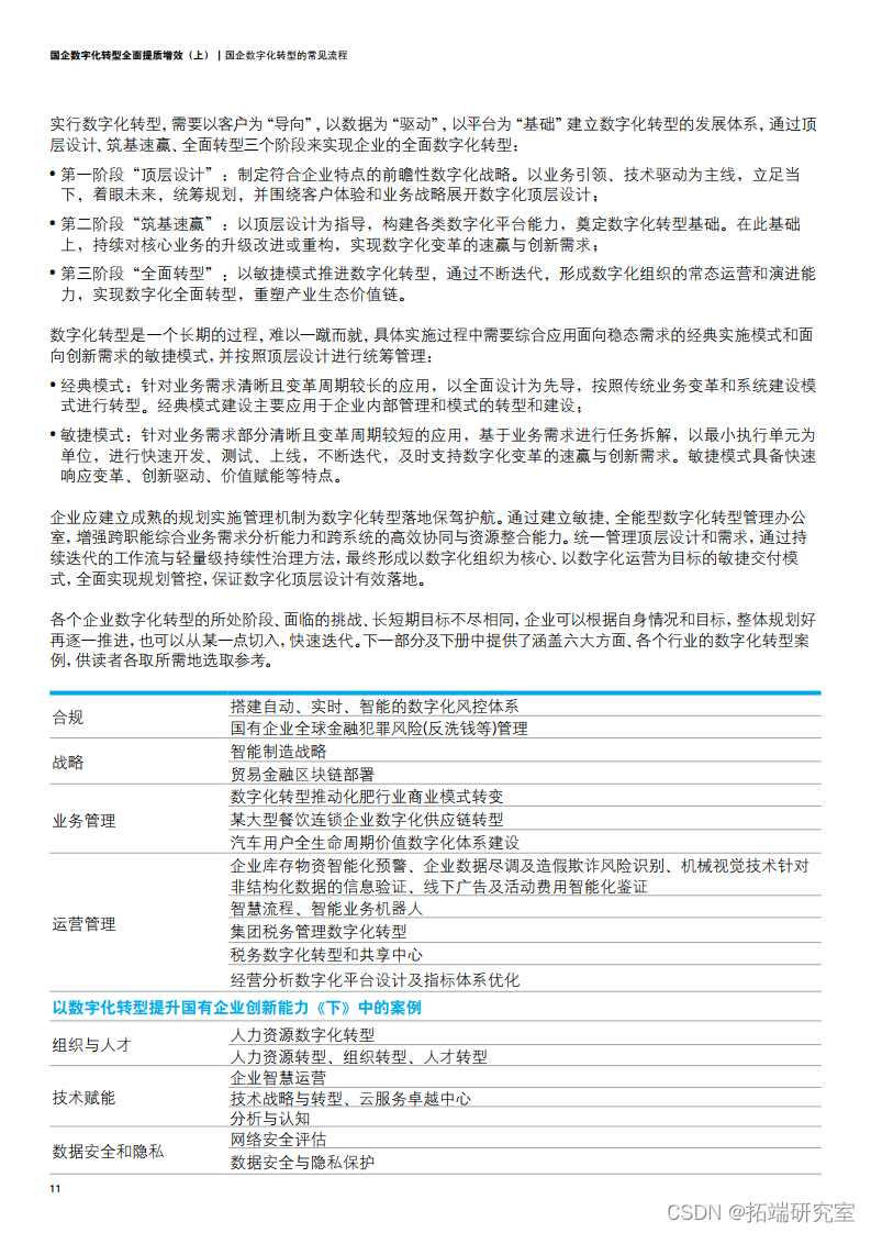 数字化转型是一个长期的大型的变革,且各企业处于不同转型阶段,为有序有效地推进转型,建议综合运用由面到点的经典模式和快速迭代的敏捷模式,提前规划数字化转型路线图。国企以数字化转型为抓手提升创新能力,我们建议从合规、战略、业务管理、运营管理、组织与人才、技术与数据安全六个层面来考虑,并在本册和下册提供了六大方面三十个企业数字化转型的具体案例,供读者思考和实操参考。