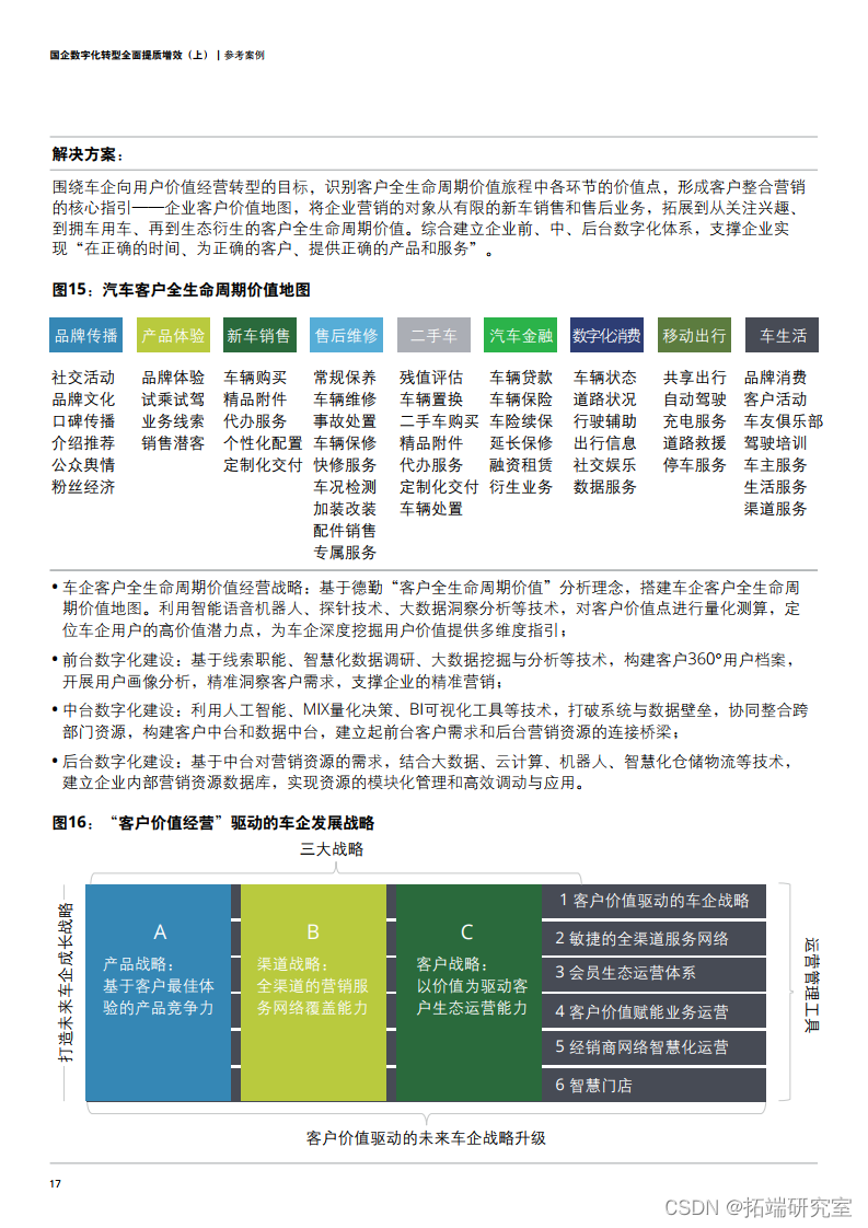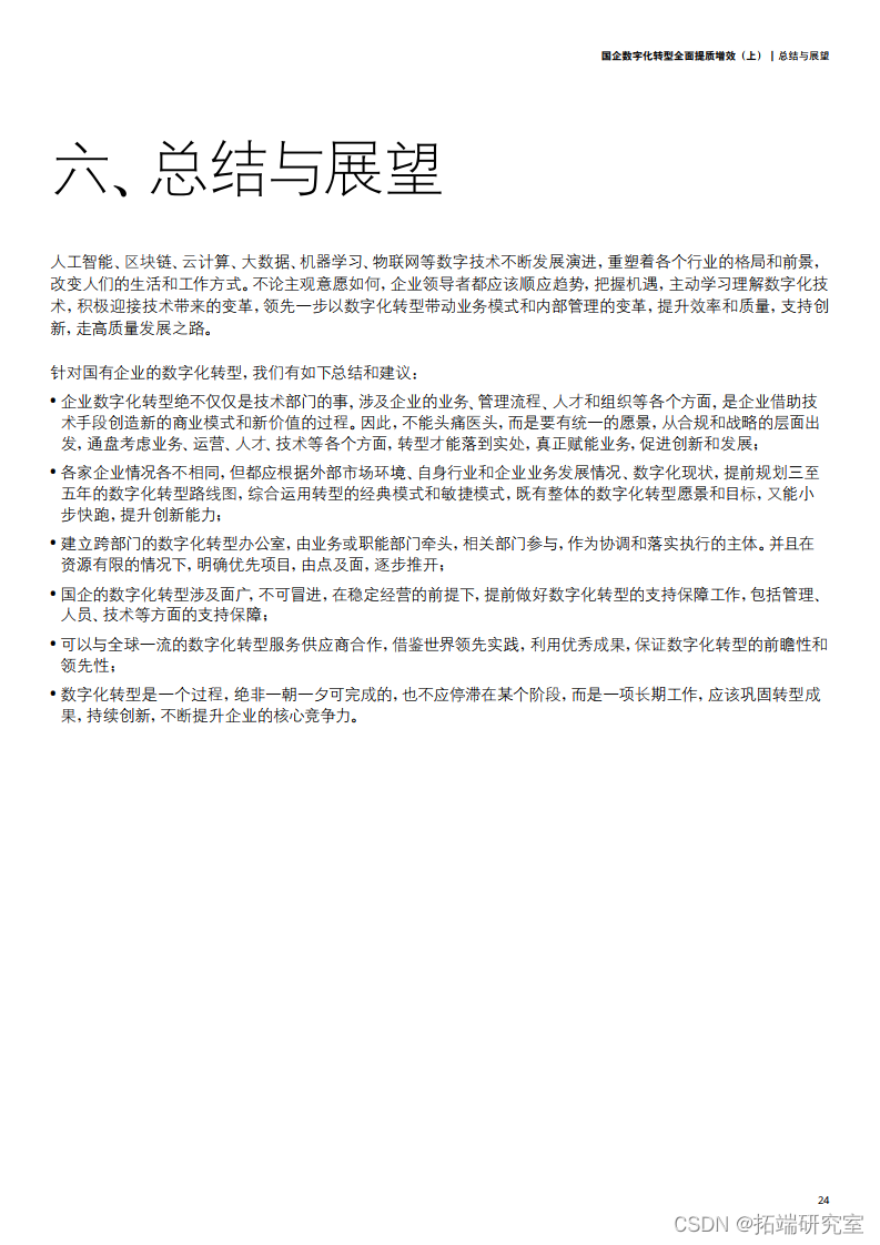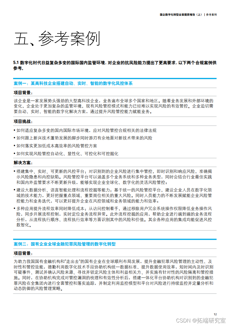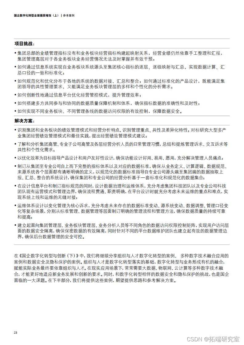 数字化转型是一个长期的大型的变革,且各企业处于不同转型阶段,为有序有效地推进转型,建议综合运用由面到点的经典模式和快速迭代的敏捷模式,提前规划数字化转型路线图。国企以数字化转型为抓手提升创新能力,我们建议从合规、战略、业务管理、运营管理、组织与人才、技术与数据安全六个层面来考虑,并在本册和下册提供了六大方面三十个企业数字化转型的具体案例,供读者思考和实操参考。