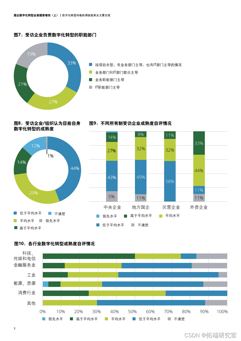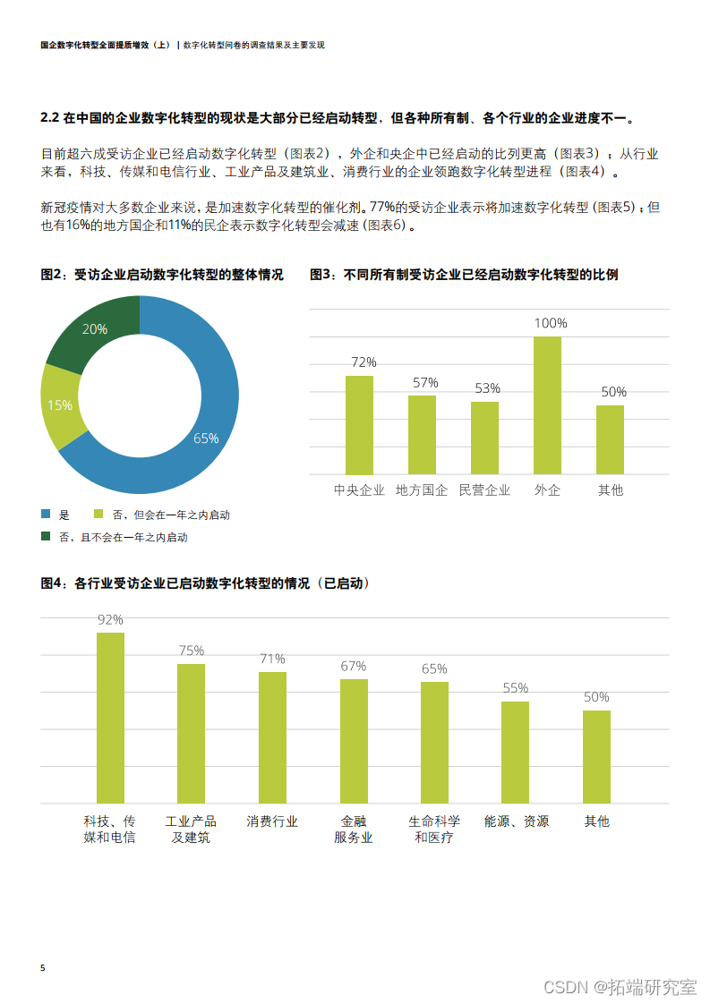 - 超过六成受访企业都已经启动数字化转型,但各种所有制、各个行业的企业进度不一。