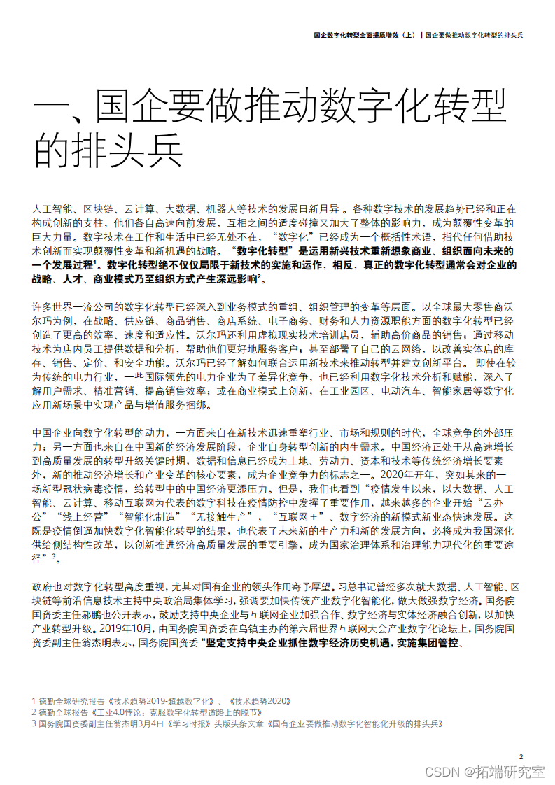 最新发布国企改革系列报告之《国企数字化转型 全面提质增效》。中国企业数字化转型的动力既来自新技术引领全球产业升级的外部压力,也来自高质量发展新阶段企业寻找新动能的自身动力。国务院国资委对国有企业已明确提出了“要做推动数字化智能化升级的排头兵”的要求和期望。数字化技术在疫情防控中发挥了重要作用,也成为中国加快数字化转型的催化剂之一。