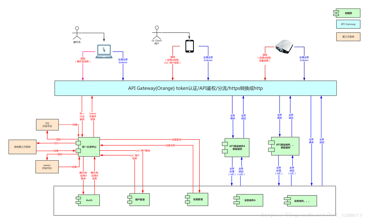 1. API Gateway(orange): 网关,可进行:分流、token认证、API鉴权、https转为http; (需提前将角色与API关系、应用id与API的关系进行存储,以供以后API鉴权使用)