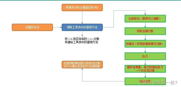 我们可以拼接查询语句,通过参数传递给查询方法,在方法内部执行注册驱动、获取连接对象、预编译(获取数据库操作对象)、执行、解析结果集、关闭资源六个步骤即可取出数据。此处选择自定义实体类作为集合元素,查询结果的每一行对应一个实体类对象,将所有对象封装到 List 集合中,返回给方法调用者。