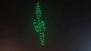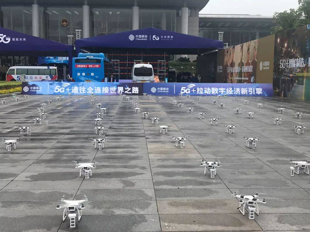 在本次大会现场,数百架无人机编队在空中整齐变换各种造型,这是在展示5G网络超低时延特性和应用。