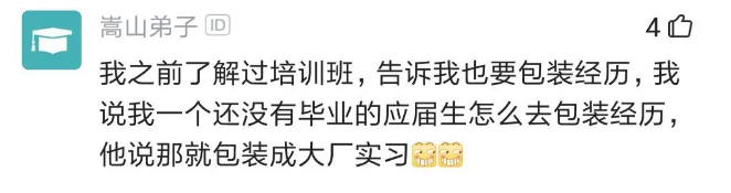 许多网友表示自己也有类似经验,有人说之前有培训班也让自己包装经历,他当时是一个还没毕业的应届生,培训班就让他包装成大厂实习生。