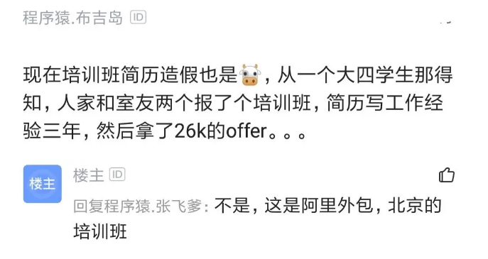 关于程序员速成培训班的传言和八卦很多,近日,又有一个程序员发帖吐槽培训班简历造假,两个大四学生报了个培训班,竟然给包装成有三年工作经验的人,更离谱的是,竟然还拿到了阿里外包26k的offer……