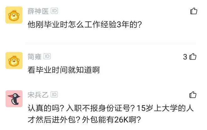 也有人质疑这种做法是认真的吗?刚毕业怎么能有三年工作经验?入职不看毕业时间?不报身份证号?按这个包装的经历,15岁就上了大学,这种人才会去当外包?再说外包能拿到26k?