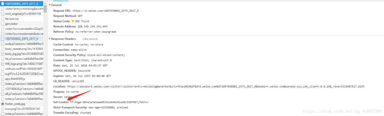 稍微比较一下两个“1087030002_2975_2017_0”请求的区别,请求头信息都差不多。最大的不同是,第一次请求是set-cookie,也就是没有cookie的值,第二次多了cookie,里面有三个值YF-Page-G0、SUB、SUBP。也就是说,这个cookie就是我们需要获取的游客cookie。