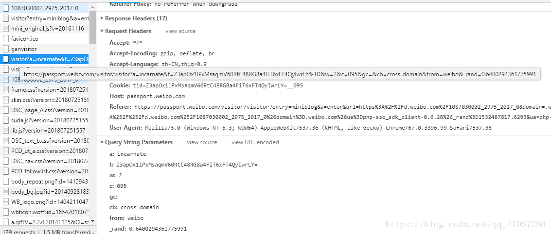 至此,我们找到了发送第6个请求(https://passport.weibo.com/visitor/visitor?a=incarnate&xxxxxxxx)的全部参数,模拟发下请求。得到结果。ok,sub和subp就全部得到。