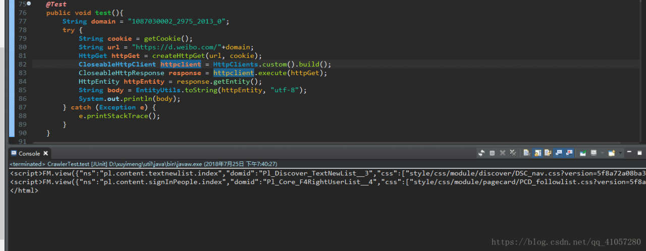 这里,博主测试的时候,cookie中不加入YF-Page-G0,无法获取到值。但大佬的文章表示不需要这个值。请自行斟酌;elipse的console是有输出限制,所以只能显示最后几行。另外,微博的页面内容都是用FM.view()填充的。