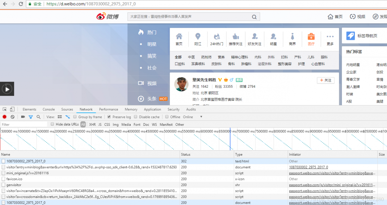 博主用微博的“发现-找人-领域页”(https://d.weibo.com/1087030002_2975_2017_0)来举例,“1087030002_2975_2017_0”是这个页面的路径名,第一次是302重定向,然后经过一系列的请求跳转,最后变成200。