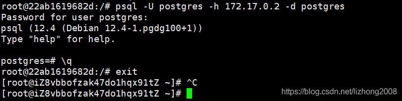 注意: postgres镜像默认的用户名为postgres,登陆口令为创建容器是指定的值。