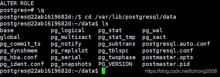 Ctrl+ D, 退出PostgresSql, 切换到 /var/lib/postgresql/data 目录,查看配置文件: