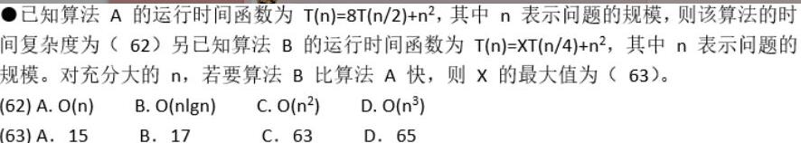 第二问,算法B比A快,意味着B的时间复杂度比A小。那么选项中均符合第三个公式的情况,那么B的时间复杂度为O(nlog4X