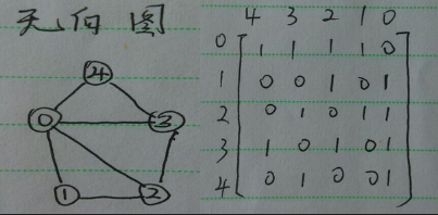 无向图邻接矩阵:其邻接矩阵第i行元素的和即为顶点i的度,例如:顶点4的度就是第四行的和,即2。