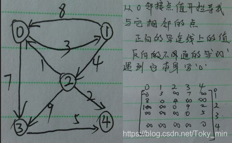 其邻接矩阵的第i行元素之和为顶点i的出度,而邻接矩阵的第j列元素之和为顶点j的入度。例如:顶点3的出度和入度分别为5和16.