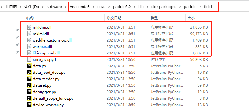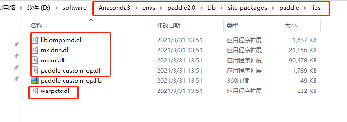 2、将xxx/paddle/libs文件下的dll(如上图所示标红的dll)拷贝到虚拟环境xxx/paddle/fluid文件夹下:我的虚拟环境fluid文件夹的位置:D:\software\Anaconda3\envs\paddle2.0\Lib\site-packages\paddle\fluid