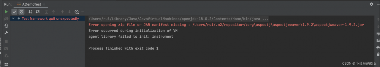 经过检查发现/Users/rui/.m2/repository\org\aspectj\aspectjweaver\1.9.2\aspectjweaver-1.9.2.jar这个路径和前面的路径是不同的,在网上查找资料,\这个是可以在windows系统支持的,但是linux系统是不支持这个的,只支持/这种,然后在pom.xml文件中找到这个路径,进行修改,就可以正常运行了