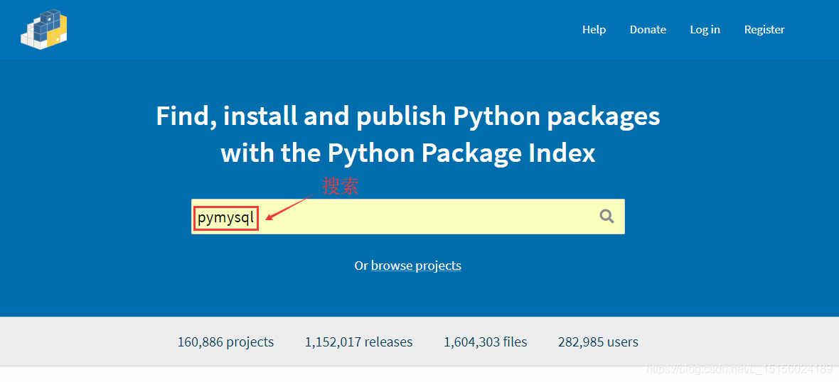 登录https://pypi.org/网站,输入pymysql,搜索PyMySQL包,如图:
