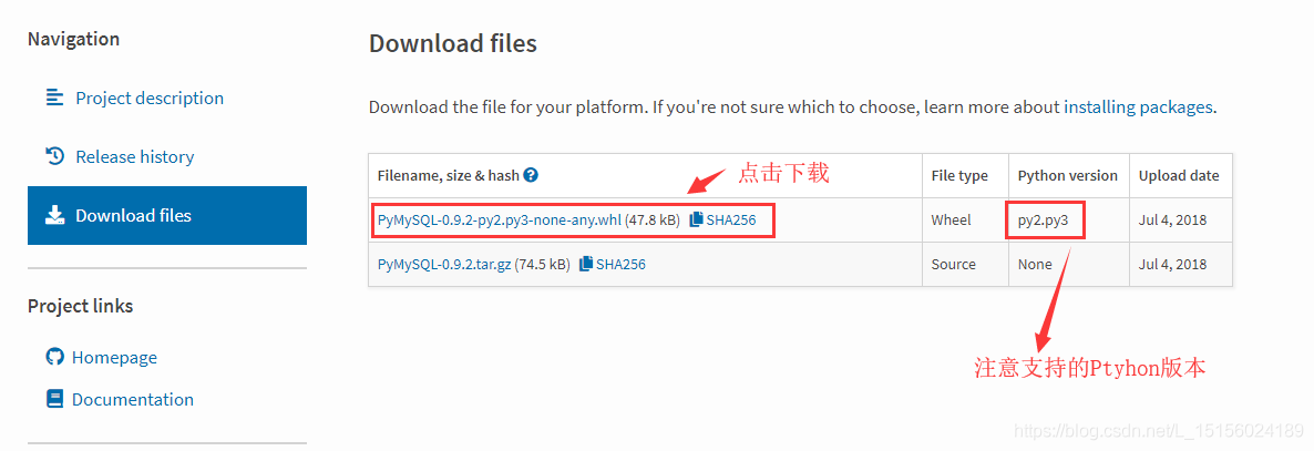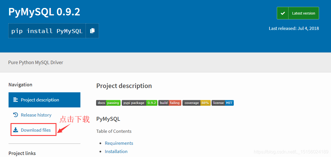 点击搜索结果PyMySQL 0.9.2后,如图: