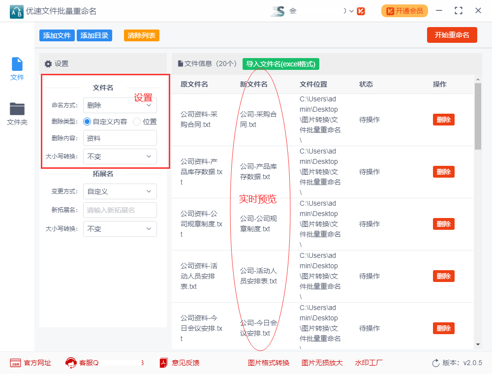 如何批量删除文件名中的指定字符或文字?工作中我们可能需要处理或者修改很多文件的名称,例如:现在电脑里有大量的文件,现在这些文件的名称中都包含看一些不需要的文字或字符,为了让文件名更加的精简,需要将这些相同的指定字符或文字删除,你会怎么处理呢?有多的小伙伴会花上很长的时间一个一个的删除,而有的小伙伴则会一键批量处理,最终只花了几分钟时间。