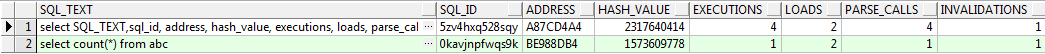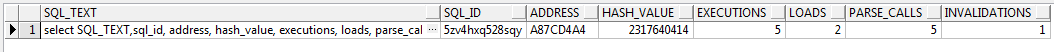 select SQL_TEXT,sql_id, address, hash_value, executions, loads, parse_calls, invalidations