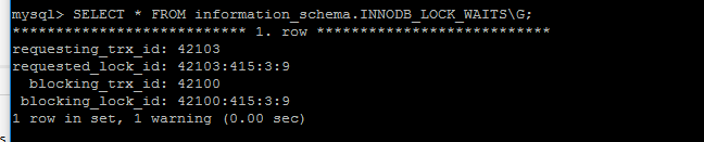 SELECT * FROM information_schema.INNODB_LOCK_WAIT\G;