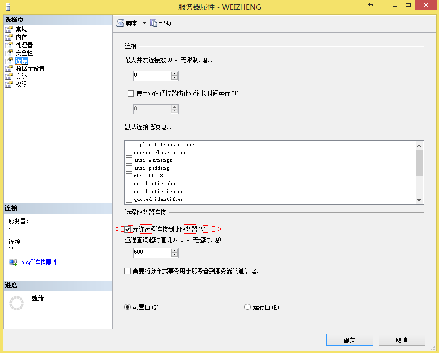 (2)在打开的属性窗口,在其右边点击“连接”,然后再左侧勾上“允许远程连接到此服务器”: