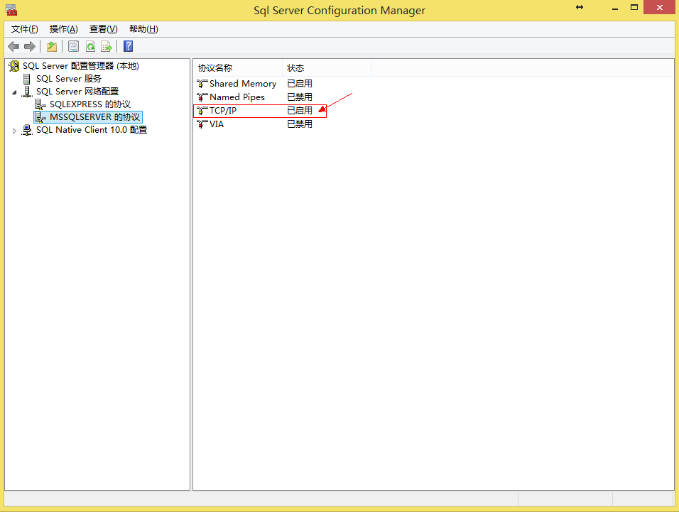 (2)打开SQL Server配置管理器后,选择SQL Server网络配置下面的MSSQLSERVER,然后看右边里面的TCP/IP是否为“已启用”,如下图所示: